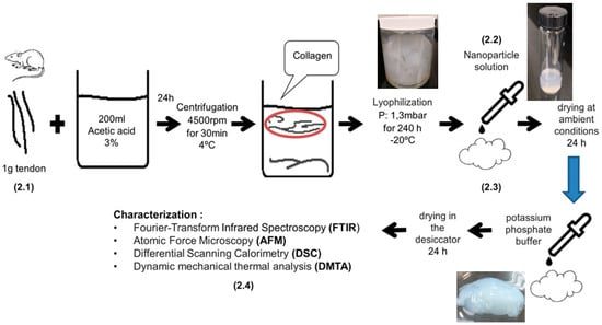 Figure 1 shows a schematic of the experimental procedures followed for the preparation of the collagen scaffolds impregnated with propolis nanoparticles, as described in detail in Section 2.1, Section 2.2 and Section 2.3. The thermal, morphological, compositional, mechanical, and cyto-toxicological characterization is described in Section 2.4.
