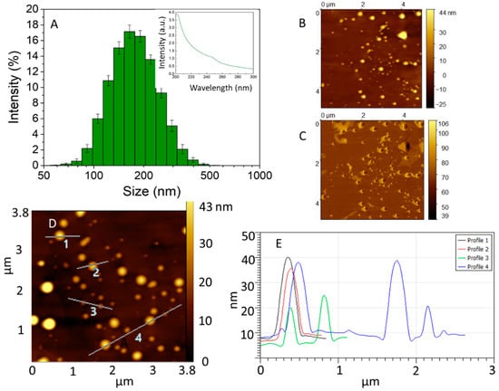 An extract rich in polyphenols was obtained from the raw propolis using ethanol as a solvent. This solvent was selected because of its low toxicity to cells in controlled amounts, good polyphenol solubility, and its previous use in the food industry to extract propolis []. The amount of polyphenols in the alcoholic extract was quantified using the Folin–Ciocalteu method []. A concentration of 9.38 ± 1.24 mg/mL was estimated. The presence of polyphenolics in the extract was confirmed due to the absorption band at 250 nm, which is characteristic of aromatic compounds, as shown in the inset of Figure 2A. The propolis extract was partially soluble in water and tended to form micellar aggregates when it was dissolved in the aqueous media. To form the NPs, ultrasound was applied during the pipetting of the ethanolic extract to water to generate shear stress, increase the local temperature, and decrease the size of the propolis aggregates. The suspension obtained was brownish and opaque. The hydrodynamic diameter of the obtained propolis particles was measured using the DLS technique (hydrated state) and AFM (semi-dried state) []. The histogram in Figure 2A shows the distribution of the particle sizes, where the average was determined to be 174.6 ± 63 nm. The obtained polydispersity was 0.11 and the Z potential was −41.2 ± 9. These results suggest a stable suspension. Figure 2B,D shows representative AFM topography images displaying particles with a pancake-like morphology, which is characteristic of soft particles adsorbed on a surface []. A low amount of organic material was covering the substrate and surrounding the particles, as can be seen in the phase image from Figure 2C. Therefore, line profiles of areas where the particles were adsorbed, as indicated in Figure 2D, indicated particles that were between 3 nm and 40 nm in height, according to Figure 2E.