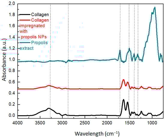 FTIR spectra of the collagen, ethanolic extract, and collagen scaffolds impregnated with propolis NPs.