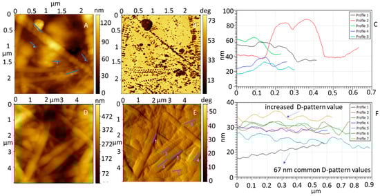 (A) AFM topography and (B) phase image of collagen impregnated with propolis NPs. (C) Cross-section of the line profiles shown in (A). (D) AFM topography image of collagen impregnated with propolis NPs. (E) Amplitude image of the topography image shown in (D). (F) Cross-section of the line profiles shown in (E). The collagen D-pattern gap was increased.