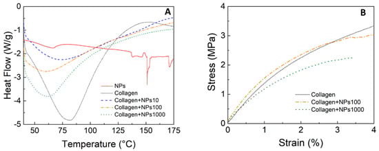 (A) DSC curves for type I collagen, propolis NPs, and collagen impregnated with propolis nanoparticles at different concentrations. (B) Stress–strain diagram of collagen impregnated with propolis nanoparticles at different concentrations.