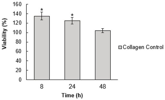 Cell viability of a 3T3 cell line incubated with collagen for 8, 24, and 48 h. The values were normalized with the results obtained for cells growing in culture media (mean % ± SD). Significant differences at p ≤ 0.05 are indicated by an asterisk (*). Significance was determined using an analysis of variance (ANOVA) test.
