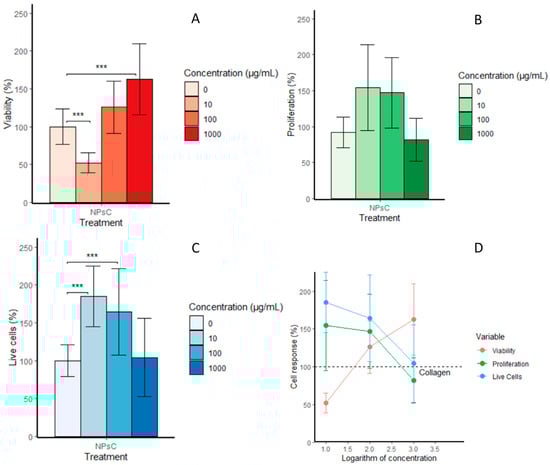 (A) Cell viability of 3T3 cell line incubated with collagen and collagen impregnated with propolis NPs at concentrations of 10, 100, and 1000 μg/mL (mean % ± SD). (B) Total cell count means determined using a proliferation assay. (C) Number of living cells. (D) Correlation of cell response and propolis NP concentration. Significant differences at p ≤ 0.05 are indicated by a line and asterisks (***). Significance was determined using an analysis of variance (ANOVA) test.