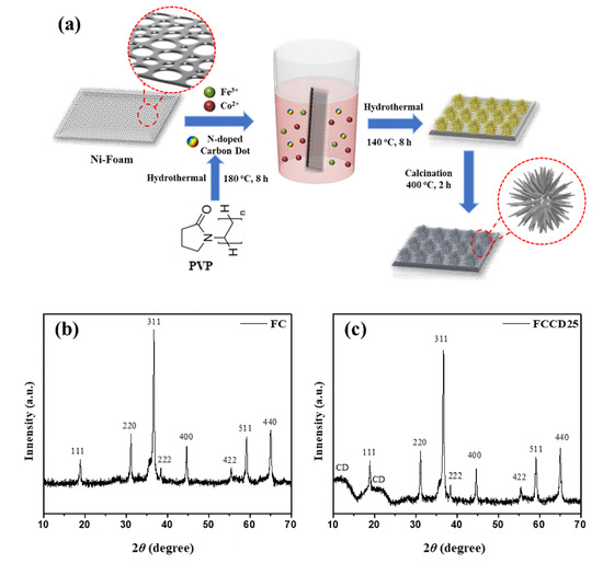 The synthesis process of nanostructured FeCo2O4@N-doped CDs (FCCD) is delineated in Figure 1a. An Fe-Co precursor was initially synthesized by a facile hydrothermal technique using the aqueous solution of respective metal salts, urea, NH4F and different amounts of CDs. Then, the Fe-Co precursor was thermally transformed into spinel FeCo2O4 via controlled calcination in air at 400 °C to obtain the product grown on Ni foam. During this calcination process, H2O and CO2 gases are released and a large number of pores are created within FeCo2O4. The major benefit of the hydrothermal method is the uniform growth of the microstructure, even in complex architectures containing various dopants and elements, without altering the homogeneity of the structure and morphology. The nucleation process also can be controlled, which results in some environmental and technological benefits, including the single-step production of crystalline materials, the energy-efficient process and the homogeneous products compared to the conventional processing of solid-state materials. In addition, this method is suitable for producing hybrid materials, oxides and non-oxides with various morphologies, which enables researchers to scale up the production level. During the hydrothermal process, mass transport occurs, which leads to the densification of the reaction materials, mostly by a dissolution precipitation mechanism, resulting in porous materials with good mechanical properties [58]. Firstly, the as-synthesized CDs were characterized to determine their particle size and elemental composition. As shown in Figure S1a, the average particle size (diameter) of the CDs was found to be 12.08 nm, measured using DLS spectroscopy. Furthermore, FT-IR spectra showed O-H stretching at 3320 cm−1, C-H stretching at 2920 cm−1, C=O stretching at 1750 cm−1 and C-O stretching at 1160 cm−1, which corresponds to the CDs (Figure S1b). In addition, the elemental composition of CDs was observed using EDS, which confirmed the presence of C, N and O in CDs (Figure S1c). The composition and purity of the obtained materials (FC and FCCD) were assessed using the XRD and EDS techniques. The XRD patterns for FC and FCCD25 are displayed in Figure 1b,c. For FC, the diffractions could be well indexed to spinel FeCo2O4 phase, corresponding to 2θ of 18.9° (111), 31.2° (220), 36.7° (311), 38.4° (222), 44.6° (400), 55.5° (422), 59.2° (511) and 65.1° (440), which are in good agreement with previous reports in the literature [59,60]. The absence of other diffraction peaks reveals the phase purity of the synthesized materials and also demonstrates that precursor is completely decomposed to spinel FeCo2O4 after calcination. In Figure 1c, the presence of characteristic peaks for FC and the appearance of amorphous CD peaks substantiates the successful growth of FC, even in the presence of CDs. The successful synthesis was also confirmed in other CD ratios (FCCD5 and FCCD40) in which the diffraction peaks of CD and FeCo2O4 can be found (Figure S2).