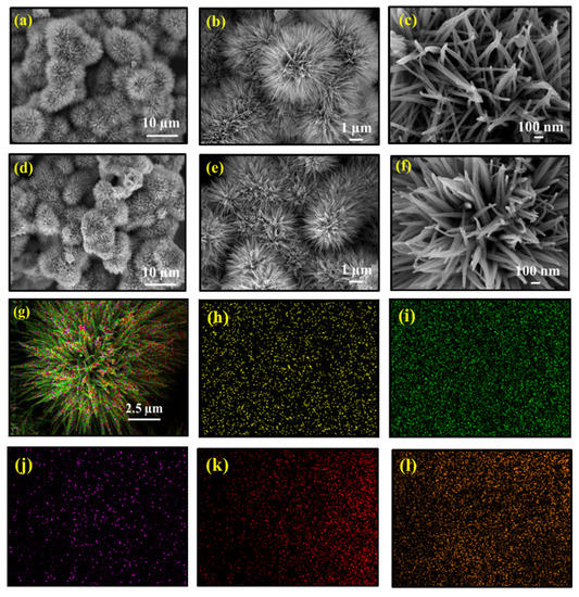 FESEM images of FC (a–c), FCCD25 (d–f) and nanoflower at different magnifications and (g) EDS mapping of FCCD25, showing the homogeneous distribution of Fe (h), Co (i), carbon (j), oxygen (k) and nitrogen (l).