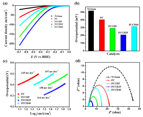 After the successful characterization of the synthesized materials, we explored their electrocatalytic activity towards HER and OER. Nickel foam (NF) has been utilized as a template for synthesis due to its higher surface area, three-dimensional porous structure and electrical conductivity, and hence it can be utilized as an electrode substrate for probing the electrocatalytic activity of synthesized materials. A blank NF (in the absence of a catalyst) was used to probe the background electrochemical activities and demonstrated insignificant OER and HER catalytic activities. Generally, materials synthesized on NF showed improved performance towards HER and OER in the case of overpotentials and their current densities. We evaluated the HER performance of different electrocatalysts (FC and FCCD) by linear sweep voltammetry (LSV) measurements in order to examine the effect of CDs on the electrocatalytic activities. The HER polarization curves for the electrocatalysts are shown in Figure 4a and Figure S9a, and it is clear that FeCo2O4 with a CD loading of 25 mg (FCCD25) demonstrates the best HER activity compared to all the electrocatalysts. A current density of 10 mA cm−2 was reached, corresponding to HER at an overpotential of 205 mV for FCCD25, which is much lower than other electrocatalysts (Figure 4b), reflecting its superiority over all the electrocatalysts. A Tafel slope of 114 mV dec−1 was attained for FCCD25, which was eventually lower than those of other samples, rendering favorable kinetics for FCCD25 (Figure 4c and Figure S9b). In addition, commercially available Pt/C on the NF electrode was used to perform a control experiment within the experimental condition (Figure S9c,d). The Tafel slope of 38 mV dec−1 was obtained for the Pt/C in the HER experiment, which is consistent with the previously reported results [65]. The Tafel slope value indicates that HER proceeds via the Volmer–Heyrovsky mechanism [66]. The EIS measurements of different electrocatalysts was performed to assess the interface charge mobility of the electrode. From the Nyquist plots (Figure 4d), the lowest Rct was achieved for FCCD25, validated by the faster charge transfer kinetics, suggesting improved electrical conductivity. Additionally, Cdl was determined to calculate ECSA (Figure S10). Based on these Cdl values and the specific capacitance of material per unit area (Cs, which is normally between 20 and 60 µF cm−2 for a flat surface), ECSA was calculated (Table S1) [67]. The Cdl value for FCCD25 was 4.25 mF cm−2, corresponding to an ECSA of 106.25 cm2. The ECSA value of FCCD25 is 6.53, 2.36 and 2.93 times higher than those of FC, FCCD5 and FCCD40, illustrating efficient adsorption and reactant transfer to improve the electrochemical reaction in the case of FCCD25.