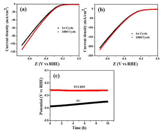 HER polarization curves of (a) FC, (b) FCCD25 before and after 1000 CV cycles, (c) chronopotentiometric study at a constant current density of 10 mA cm−2.