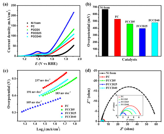 All the electrocatalysts grown on Ni foam were checked for their OER activities (electrolyte: KOH 1 M). Figure 6a shows that FCCD25 possessed a much higher activity than other electrocatalysts. A strong peak of Co3+/Co4+ (1.25–1.5 V) can be found in Figure 6a, which is more prominent for FCCD25, implying that FCCD25 can facilitate the oxidation and promote the OER process [68]. To generate a current density of 50 mA cm−2, FCCD25 required an overpotential up to 393 mV, while other electrocatalysts needed much higher overpotentials (Figure 6b). Furthermore, the Tafel slope for FCCD25 was found to be 105 mV dec−1 (Figure 6c). In contrast, a high Tafel slope was obtained for FC (237 mV dec−1), FCCD5 (183 mV dec−1) and FCCD40 (191 mV dec−1). Therefore, it is obvious that FCCD25 demonstrates the best OER activity due to its smaller overpotential, with a higher rate of OER, which is reflected from its small Tafel slope. The higher ECSA value of FCCD25 (Table S1) compared to the others could facilitate the penetration of electrolytes through the working electrode, hence confirming the improved interfacial contact towards the electrolyte and enhancing the surface reactions [69]. As the OER process is also related to the Rct value, EIS spectra for different electrocatalysts were tested. From Figure 6d and Table S1, FCCD25 exhibits the lowest Rct value (1.15 Ω), whereas others show higher values, confirming the better OER activity of FCCD25.