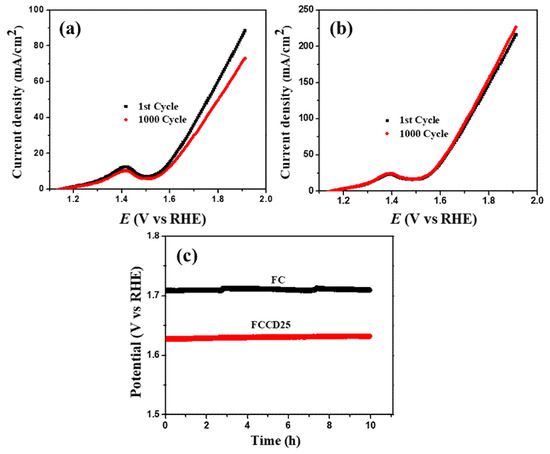 Oxygen evolution reaction (OER) polarization curves of (a) FC, (b) FCCD25 before and after 1000 CV cycles, (c) chronopotentiometric study at a constant current density of 50 mA cm−2.
