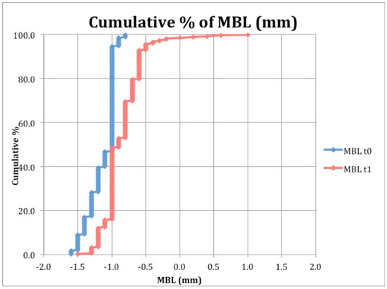 Cumulative percentage of MBL at baseline (t0) and after 2 years from loading.