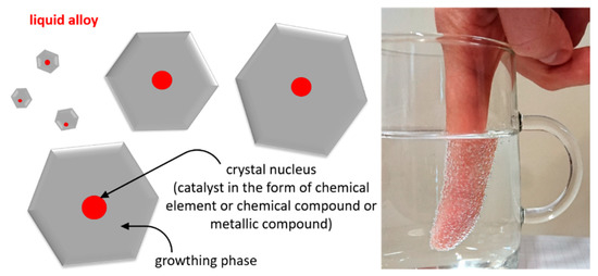 The compounds and elements introduced into the melt affect the crystal nucleation in alloys via modifiers, as in the case of the finger immersed in fizzy water shown in the photo, where the “nuclei” on its surface appear in the form of carbon dioxide particles. The modification process for chromium cast iron is interpreted in different ways. The literature states that only a small amount of modifier should be used to avoid considerable changes in the chemical composition and adding extra microstructure components. Some publications recommend adding elements at the quantity of up to 5% by weight to modify the structure. Here, only the nucleogenic modification is considered necessary to create crystallization underlays. Jura [13] defined the modification identifies of modifiers with alloy additives, stating that “the modification process consists of introducing certain alloy (modifying) additives into the melt. The additives, referred to as modifiers, stimulate a change in the primary structure”. The modification process is defined mainly by the quantity of modifiers added, their type, the method of introduction, and particularly the final effect. The reason for using modifiers is that they can change the structure and improve the performance of casting products. These results satisfy casting manufacturers.