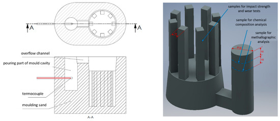 The melting batches were performed in a medium-frequency laboratory induction furnace (PI25, ELKON Sp. z o.o., Rybnik, Poland) with a capacity of 25 kg. The experimental melts used only a small amount of charge material (about 12 kg). To maintain a uniform pouring temperature and avoid undercooling (solidification) of the alloy in the ladle, the temperature was also measured in the mold used to make samples for impact strength and abrasive wear resistance tests. For this purpose, ATD-P and ATD-Pi molds were designed [19]. Figure 2 presents the scheme of the mold and a 3D casting model with marked sampling locations for individual tests. Samples were taken for metallographic, impact strength, abrasive wear resistance, and alloy hardness tests.