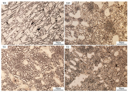 Studies on grey cast iron [14,15,16] have shown that increasing the amount of titanium in an alloy may increase the formation of primary austenite dendrites. The addition of titanium into the melt increases liquidus temperature by forming the crystallization underlays for primary austenite. The addition of a small amount of titanium creates fine interdendritic graphite. The latest research by Alonso et al. [17] indicated that Ti carbonitrides that precipitate on Mg-Ca sulfides and inhibit their growth could be the perfect crystallization underlays for graphite nucleation. Opinions differ regarding the mechanical properties of grey cast iron. Larranaga et al. [16] mentioned that the addition of 0.3% Ti in grey cast iron may improve the UTS (ultimate tensile strength) of the alloy, while others point out that the content of titanium should not exceed 0.075% because higher amounts can lead to decreased strength. Another study [16] confirmed that the addition of Ti up to 0.4% with a low content of S in grey cast iron significantly increased the tensile strength. The addition of titanium via microalloying has an important role in the production of high-strength steels. Ti in steels influences the grain refinement strengthening and precipitation strengthening [18]. As a result, titanium microadditions increase the yield strength and impact toughness of steel plates and line pipes.