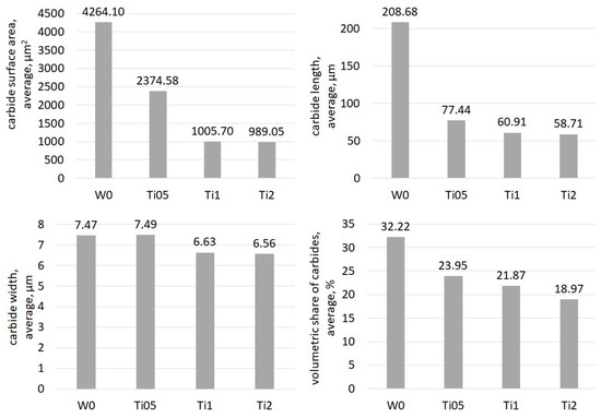 The results of selected stereological parameter measurements of eutectic carbides and carbide share analysis are presented in the form of graphs in Figure 4. The presented parameters decrease as the amount of titanium increases, but considering the values of average carbide length, it can be noticed that the largest changes occur for the alloy with 0.5% Ti added (Ti05). The average length of carbide in the Ti05 sample is almost 3 times smaller than the same parameter for the sample without Ti (W0). On the other hand, the difference between Ti05 and Ti1, where the addition amount was 2 times bigger, is only 26%. Moreover, the average surface area of the carbide for the Ti2 sample is only about 2% smaller than the parameter measured for Ti1. A similar difference occurs for the average length value for those samples, which only equals about 3%. Comparison of the alloy containing 1% Ti to the alloy containing 2% Ti shows that in spite of the double modifier level, the sizes of carbides do not noticeably change. The differences in the average widths of carbides in all alloys range do not exceed 1µm. Analyzing the average volumetric share of the carbide phase in the investigated areas allows us to conclude that the use of modifying additives under analysis contributes to the decrease in the carbide phase share in chromium cast iron.