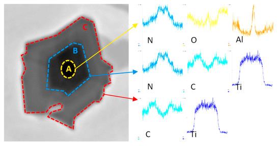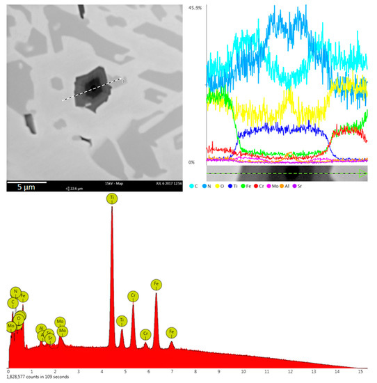 The microstructure of all experimental chromium cast iron samples abounds with γ + M7C3 eutectics, but also contains the precipitates of primary austenite or hypereutectic chromium carbides. Chromium cast iron samples with titanium added contain phases defined as titanium carbides, which are also visible in microstructure photos under light microscopy. Additionally, phases with aluminum occur in both the alloy without modifying additives and in cast iron samples containing titanium. However, in chromium cast iron with titanium added, the inclusions appear inside the Ti compounds, creating a complex compound of titanium, carbon, nitrogen, and aluminum. An example of analysis of a complex Ti compound with other elements is presented in Figure 5. Figure 6 presents the compounds under analysis divided into 3 zones that are visible under a microscope and linked with the levels of the elements. Analysis of the figures allows us to notice that the titanium carbide defined in the preliminary studies crystallizes on an underlay and is probably the compound containing the titanium, carbon, and nitrogen, which is indicated by elements found in zones B and C (see Figure 6). The underlay for the carbide–nitride under analysis could be aluminum oxide or nitride, as shown in the elemental analysis in zone A. In zone C, there may also be a small amount of molybdenum, as shown in the linear analysis (see Figure 5).