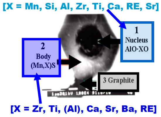 The occurrence of nucleation substrates in the form of oxides, nitrides, or sulfides is perfectly described in the studies conducted by Riposan, who analyzed the crystallization of graphite inclusions in grey cast iron [23,24]. Observing the analysis performed by Riposan (see Figure 7) allows us to find similarities to the investigations performed herein.