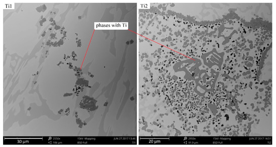 Ti-containing phases in the microstructures of samples with 1% and 2% addition of Ti, as viewed under SEM.