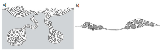 The discussed phenomena linked to the turbulent flow of liquid were described in detail by Professor John Campbell [25]. Figure 11 presents his schematic diagram of closing ceramic particles in inclusions during the turbulent pouring and filling of the mold cavity. A similar phenomenon can occur for TiC agglomerates; therefore, based on Professor Campbell’s theory, a hypothesis for the creation of titanium carbide (TiC) agglomerates under observation was developed. The schematic diagram of TiC agglomerates as supposed by the hypothesis of the TiC closure mechanism in inclusions, as presented by the authors of the paper, is presented in Figure 12.