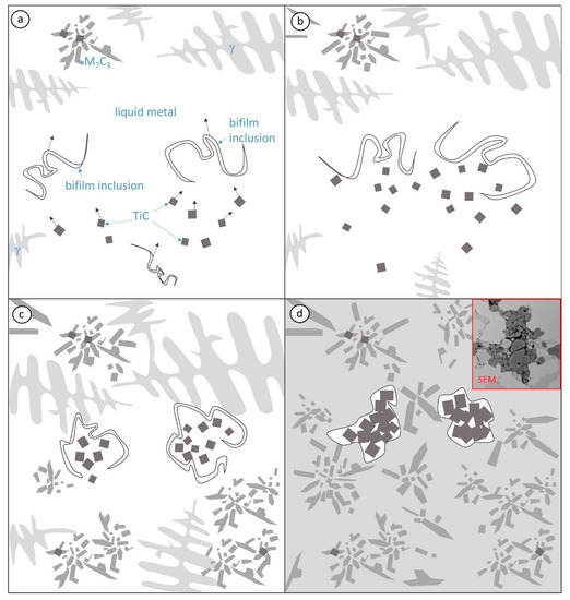 Schematic diagram presents four steps (a–d) of formation of agglomerates with Ti-containing phases according to the closure hypothesis in bifilm inclusions.