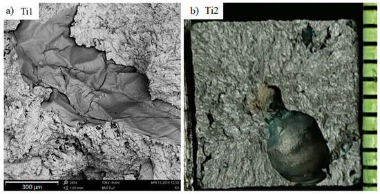 The fracture surfaces of the investigated samples have a brittle character, which is typical for high-chromium cast iron. The macroscopic metallographic analysis allows us to notice numerous oxide inclusions, especially in samples with added titanium. Figure 13a presents magnifications of undulating oxide films that appear in samples. In certain samples, large gas bubbles can also be seen in the fractures (Figure 13b).