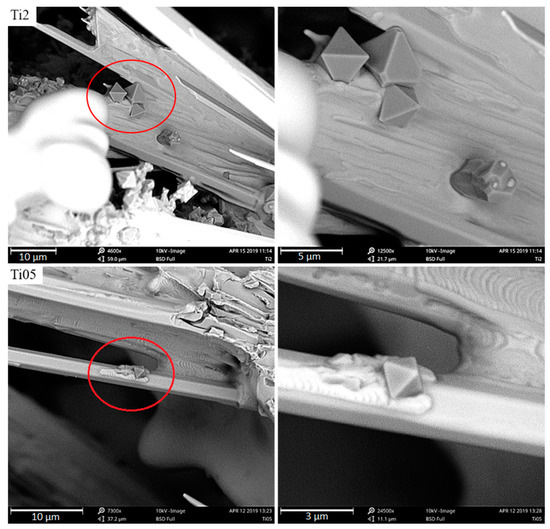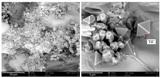 Observing Ti-containing phases this way makes it easier to verify their shape. In the samples under analysis, they adopt an octahedral shape, i.e., a regular octahedron. At higher titanium concentrations, the compounds accumulate more intensely, creating huge agglomerations that appear to have been pushed into the crystallization front, together with inclusions towards the casting center. When the supply of liquid metal feeding the crystallizing casting ends, they remain in the axial pores of the sample in austenite dendrites. The majority of titanium carbides occur in austenite dendrites, as shown in SEM micrographs. This analysis suggests that the TiC in the examined chromium cast iron is mainly a crystallization underlay for austenite. Coming back to the analysis of the chemical composition and the crystallization analysis presented in other papers [2,3], this theory can be accepted because the results of the crystallization study show that the obtained alloys are hypoeutectic or nearly eutectic chromium cast iron samples, where austenite crystallizes as the first phase. Nevertheless, the nucleogenic action of TiC on M7C3 carbides is not excluded due to the similarity of the crystallographic grid parameters mentioned in the introduction and the results of studies provided by domestic and foreign scientists. The tests of metallographic samples also indicate the presence of Ti-containing phases together with γ + M7C3 eutectics and inside the eutectic chromium carbides. On the surface of the fracture, no titanium carbides were noticed. Figure 15 presents Ti-containing compounds in eutectic grains and primary chromium carbides.