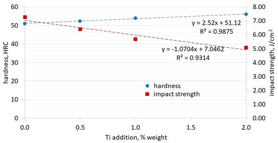 Hardness and impact strength test results for samples with addition of Ti.