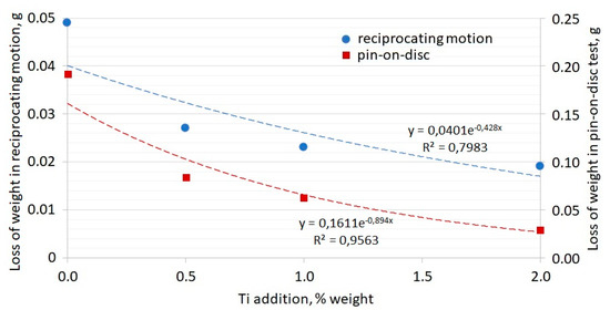 Figure 18 shows a graph presenting the losses of weight for chromium cast iron samples, depending on the quantity of the modifying addition for the two test methods. Analysis of the results presented in the graph allows us to conclude that the additions reduce the abrasive wear of the chromium cast iron under analysis. However, the non-proportional impact of Ti additives on improving the abrasive wear resistance of the cast iron under analysis is noticeable. It is worth noting that the differences in weight loss between samples with 0.5% of Ti, 1% of Ti, and 2% of Ti are reduced compared to the differences of weight loss between samples without Ti (W0) and with 0.5% of Ti. This is why doubling the Ti addition amount from 0.5 to 1% and from 1 to 2% does not provide constant effects in reducing abrasive wear. There is no clear linear dependency. The values of weight loss change exponentially. This is especially visible for the results from the pin-on-disc test. Doubling the quantity of the Ti modifier does not result in doubling the weight loss reduction.
