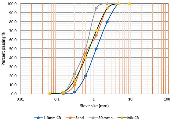 In this research, the materials used in the fabrication of a rubberized ECC containing nanographene are shown in Figure 1 as follows. (1) Ordinary Portland cement (OPC, Tasek Concrete, Selangor, Malaysia) Type I in line with the specifications of ASTM C150 [51]. (2) Class F fly ash (FA, Manjung Power Plant, Perak, Malaysia) in accordance with the requirement specifications prescribed in ASTM C618-17 [52] with a density of 1300 kg/m3 and an amount of (Al2O3 + Fe2O3 + SiO2) 82.12% and below 6% of loss on ignition. FA was used in the mixture to reduce the cost of the material, and it behaved like an intense water-reducing substance. FA is a byproduct of pulverized coal being burned in thermal electric generation plants and is waste material that has pozzolanic properties classified as cement-replacing materials. The chemical contents of OPC and FA are presented in Table 1. (3) Local washed river sand was used in the mixes conforming to ASTM C33-M16 [53]. The sizes of 0.3–1.18 mm and the sand/cementitious ratio of 0.36 were utilized to maintain the adequate stiffness and volume stability and also to obtain the better fresh and hardened properties of rubberized ECC containing GO. (4) CR particles were varied from 0% to 10% and used as a partial replacement of sand by volume, combining sieve size of 30 mesh and sieve size of 1 to 3 mm in the appropriate mixed proportions of 60% and 40%, respectively [54]. In order to reach a trend similar to that of sand particles, where the sand is replaced with the crumb rubber, the final gradation of crumb rubber contained 60% of passing size #30 mesh and 40% of passing size 1–3 mm. The specific gravity of crumb rubber is 0.95, replacing the amount of fine aggregates by volume percentage. The sieve analysis of the fine aggregate and crumb rubber is shown in Figure 2 (5) Polyvinyl alcohol (PVA, Kuraray, Chiyoda-ku, Tokyo 100-8115, Japan) fibers (Table 2) were added to cementitious composites with a fixed volume of 2% to achieve uniform dispersion and workability and to respect the principles of micromechanics requirements in order to improve ductility and high strain in the cementitious matrix. (6) Graphene oxide (GO, Graphenea, San Sebastián, Spain) having a concentration of 4 mg/mL was used and ranged from 0.01% to 0.05%. The physical properties of GO and its elemental analysis are shown in Table 3 and Table 4. An aqueous solution of superplasticizer known as modified polycarboxylate-based (HRWR) “Sika Viscocrete-2044” was used to adjust the mixtures to obtain the desired flowability. Sika Viscocrete-2044 (Sika Kimia, Negeri Sembilan D.K., Malaysia) is a polycarboxylate superplasticizer (SP) in liquid form with a 6.2 pH value and a 1.08 specific gravity, and there is absence of chloride ion content. Water that is suitable for drinking is usually considered acceptable for mixing the concrete. In this study, the water-to-cement ratio was set to 0.215.