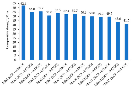 Figure 5 shows that the compressive strength decreased gradually as the CR percentage increased, whereas the increment of GO percentage led to an increase in the compressive strength. This finding is in line with the previous studies that confirmed the negative effect of added CR to the compressive strength of the ECC [5,26].