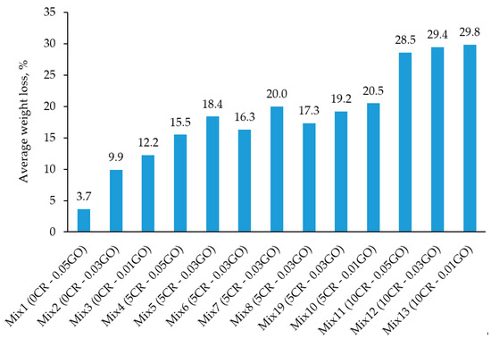 Figure 7 shows the results of the acid attack test of the 13 mixes of the rubberized ECC containing GO. The results were obtained by calculating the average percentage weight loss of the mixes after the samples were immersed in a 5% suspension of sulfuric acid (H2SO4) for 28 days. From the results, it can be deduced that the lowest average weight loss (3.7%) was reported in Mix 1, having the highest percentage of GO (0.05%) and lowest percentage of CR (0%). On the other hand, Mix 13 was reported to have the highest weight loss percentage of 29.8%. Mix 13 had the highest CR (10%) and the lowest GO percentage content of 0.01%.