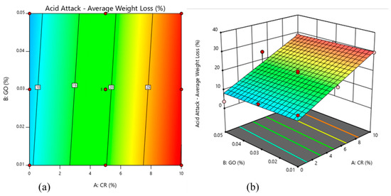 Acid attack of rubberized ECC with GO: (a) 2D contour plot and (b) 3D surface response.