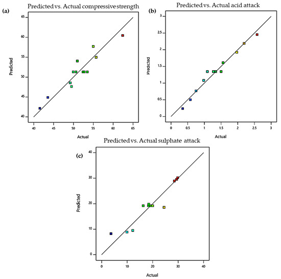 Normality plot of residuals for (a) compressive strength, (b) acid attack, and (c) sulphate attack.