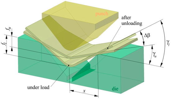 where γl = is the bend angle under load, γu = is the bend angle when the load is released (Figure 2). Angle Δβ defines the difference between bend angles under load γl and after unloading γu. For all punch depths under load, three bending tests were conducted and then the average value of springback was evaluated.