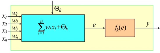 The operation of the ANNs is based on the idea of parallel processing. Each signal is introduced to the neuron through a connection of a certain weight (Figure 3). In addition, each neuron has a threshold value that determines its level of excitation. In the k-th neuron, the sum of the input signal values xn multiplied by the weighting factors wn is calculated, which is then increased by the bias Θk. The stimulation e of the neuron is transformed by a specified activation function of the k-th neuron fk(e), which determines the nonlinear relationship between the input and output signals of the neurons. The most commonly used activation functions include the threshold function and its modifications (i.e., binary step) as well as nonlinear functions (sigmoid, logistic function, hyperbolic tangent, etc.).