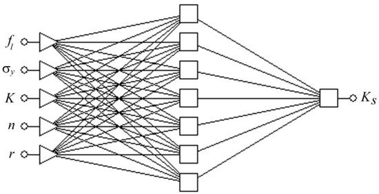 The Multilayer Perceptron (MLP) function has been selected to model the springback phenomenon. The network learning process uses a data set containing process parameters, the mechanical properties of the test sheets, and the corresponding values of the springback coefficient Ks, which was determined in the bending test. As the input signals to the network, the following parameters have been initially selected: punch bend depth under load fl, Young’s modulus E, yield stress σy, ultimate tensile stress σm, strain hardening coefficient K, strain hardening exponent n, and Lankford’s coefficient r. Sample orientation was not explicitly entered at the network input. However, this orientation in the input data to ANN was identified by different mechanical parameter values measured for these two orientations. The expected signal at the output is the coefficient of springback Ks. The training data consist of 54 training sets. Factors affecting the amount of springback should significantly affect the elastic strains of metallic sheets and they must be independent of each other [36]. The selection of factors affecting the amount of springback is difficult due to the complex interactions of many parameters often correlated with each other.