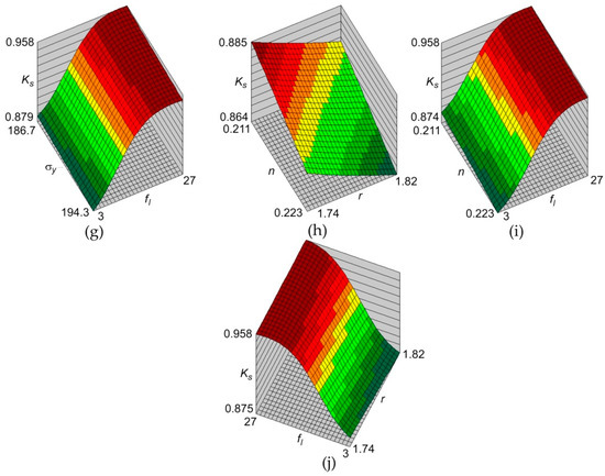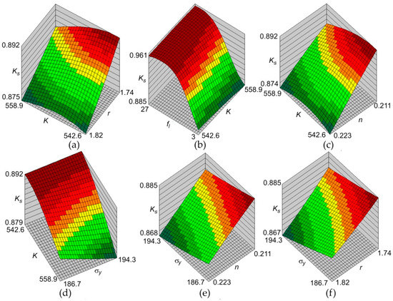 The surface responses of the MLP 5:5-7-1:1 network are shown in Figure 7. It is clear that increasing punch bend depth under load fl leads to an increase in the predicted springback coefficient Ks. On the contrary, the predicted value of Ks coefficient decreases with increasing of yield stress σy, strain hardening exponent n, and Lankford’s coefficient r.