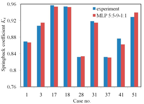 Quantitative comparison of the springback coefficients Ks determined experimentally and by MLP 5:5-9-1:1.