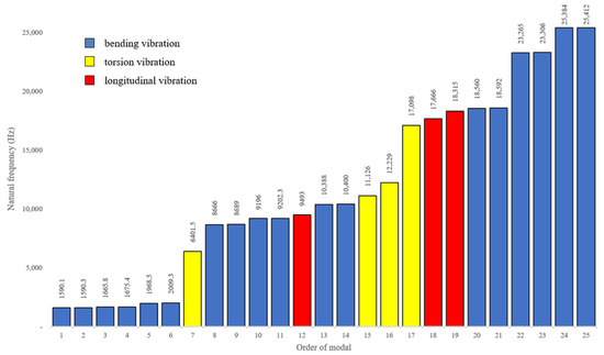 Modal analysis is carried out to investigate the natural frequency and vibration shape of the turning system. The front face of the flange is set to be fixed to ground. After setting the contact region and meshing, 25 order resonant frequencies were calculated as shown un Figure 3. At the 12th, the 18th and the 19th modal the horn vibrates longitudinally, their resonant frequencies are 9493 Hz, 17,666 Hz and 18,315 Hz. Figure 4 describes these three modal shapes. As presented in figure, the 19th vibration mode is in positive agreement with requirements because it outputs the largest relative deformation, and its maximum vibration occurs at the front end of the horn, whereas the back end and the transducer only vibrates slightly. More detailed analysis will be examined in harmonic response analysis.