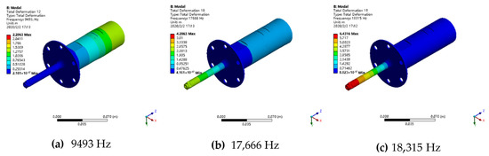 Modal shape of the first three longitudinal vibrations. (a) 9493 Hz; (b) 17,666 Hz; (c) 18,315 Hz.