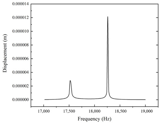 In the modal analysis, the vibration mode is relative value, which cannot reflect the true amplitude of the ultrasonic turning device at the tool. It is crucial to further analyze the harmonic response of the device on the basis of the 19th mode to obtain the amplitude at the tool tip. The harmonic response analysis is then conducted by workbench. Remote force is applied along the horn direction on its back end. The sweep range is set to between 17,000 Hz and 19,000 Hz (based on the 19th mode) with 100 solution intervals. Figure 5 shows the output displacement curve of the setting frequencies regarding the turning tool installed on the top of the horn. It could be observed that near to the frequency of 18,260 Hz, the structure is in the state of resonance, where the output displacement reaches the peak as 12 μm.