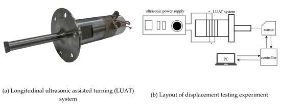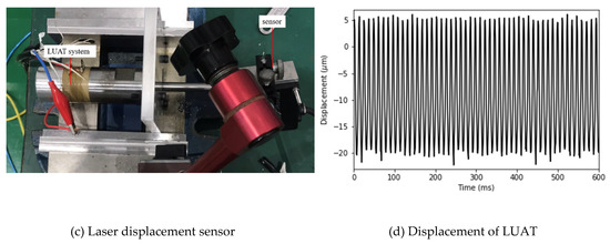 Displacement testing experiment. (a) longitudinal ultrasonic assisted turning (LUAT) system; (b) layout of displacement testing experiment; (c) laser displacement sensor; (d) displacement of LUAT.