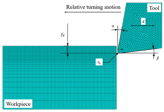 Figure 7 shows the parameters and meshing of BMG turning simulation. YG-8 cemented carbide tool with 10° rake angle α and 7° relief angle β is chosen, and the nose radius is set as 0.2 mm. The longitudinal ultrasonic vibration is applied to the tool in the amplitude A paralleling to the relative turning motion. Due to the short cutting distance, the deformation of the turning tool could be ignored, and the tool is then set as a rigid body. In order to reduce the amount of calculation and ensure the accuracy of calculation, the side grid close to the cutting surface is relatively dense, and the side grid of the principle cutting surface is relatively sparse.