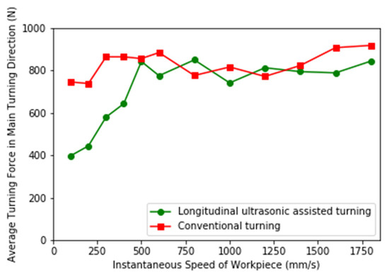 It can be seen from Equation (9) that α decreases with the decrease of , and the decrease of instantaneous speed of workpiece will increase the time when the resultant velocity is opposite to the main cutting speed in a cycle, and the time ratio of tool tip backward increases in displacement. The cutting force decreases significantly when the tool tip recedes, and then the average cutting force decreases.