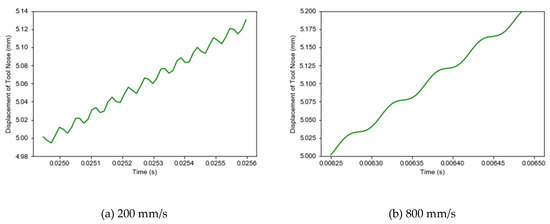 Displacement trajectory of the tool tip. (a) 200 mm/s; (b) 800 mm/s.