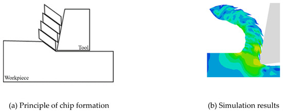 Formation of BMG chips. (a) Principle of chip formation; (b) simulation results.