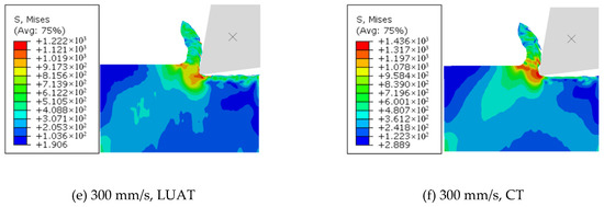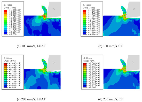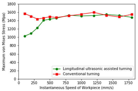 The von Mises stress field obtained at different workpiece speeds from the simulation of LUAT and CT is shown in Figure 12. It can be noticed that in low-speed turning, the maximum von Mises stress of LUAT is significantly smaller than that of CT. With the increase of workpiece speed, the machining stress of LUAT increases gradually. In high-speed turning, the machining stress of LUAT is similar to that of CT. This is consistent with the observation from the average turning force above. Lower average turning force has an effect on von Mises stress in low speed LUAT. In addition, taking the contact-separate phenomenon into account, the relationship between the tool and the workpiece changes from continuously extrusion to discontinuously impact. The lower the turning speed is, the longer time the tool is separate to the workpiece in a single period, thus the materials in between can spring-back and release the stress. However, when the turning speed goes up, as the separated time decrease, the turning process becomes increasing continuously, hence the spring-back no longer happen. In short, the effect of longitudinal ultrasonic vibration only works at low turning speed when turning the BMG.