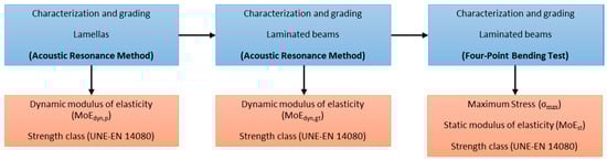 Chart flow of the general experimental procedure. MoEdyn,p: Dynamic modulus of elasticity of planks. MoEdyn,gt: Dynamic modulus of elasticity of glulam timber. σmax: Maximum stress in bending. MoEst: Static modulus of elasticity.