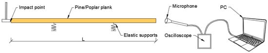 All the planks were subjected to an ART [20,21] in a flatwise orientation by placing them on two elastic supports and hitting them with a hammer (Figure 2). Response vibration signals along the longitudinal direction were collected with a t.bonne MM-1 Thomann microphone (Thomman GmbH, Burgebrach, Germany) and transduced to an electrical signal recorded with a Picoscope® 4424 oscilloscope with 80 MS/s (Pico Technology, Cambridgeshire, UK). The fundamental resonance frequency f1 of each plank was obtained by means of spectral analysis. Using this frequency and the density of each plank (ρp), the dynamic elastic modulus (MoEdyn,p) can be estimated as follows: