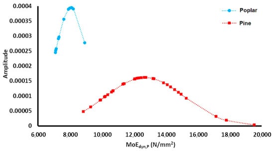 Each particular sample was subjected to a longitudinal ART [20,21] as described in Section 2.3 and shown in Figure 2, thus obtaining the longitudinal dynamic modulus of elasticity (MoEdyn,gt), including the MC = 12% correction for each sample.