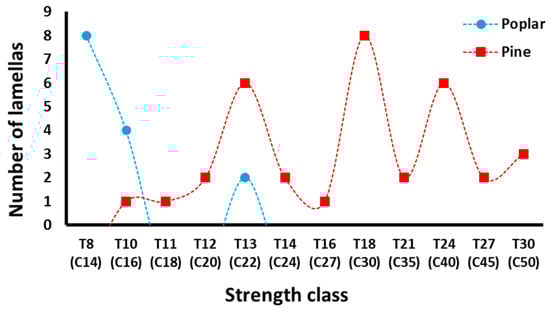 By using the MoEdyn,p, all the planks were graded according to Table 1 in Section 5.1.4.1 from reference [26]. That standard also associates the T strength class of the planks, which comply with the minimum values of C strength class for sawn structural timber according to standard [27]. Figure 4 shows the distribution of planks for each particular T and C class. Within each T strength class, the planks were considered structurally equivalent and were randomly selected for glulam timber manufacturing.